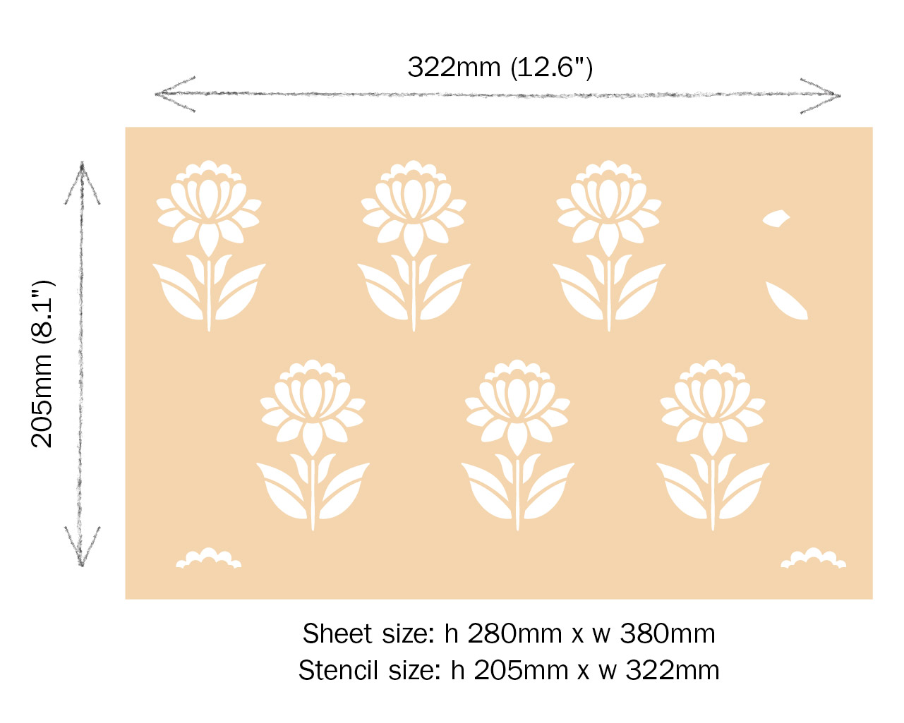 These stencil designs were inspired by Annie’s visits to Rajasthan in India, where we run our painting retreats. A visit to the Lotus Room in Udaipur’s City Palace, which is covered from floor to ceiling with colourful hand painted designs, was the inspiration behind this collection. As soon as Annie saw the graphic flowers and intricate borders, she knew they would make wonderful stencils.